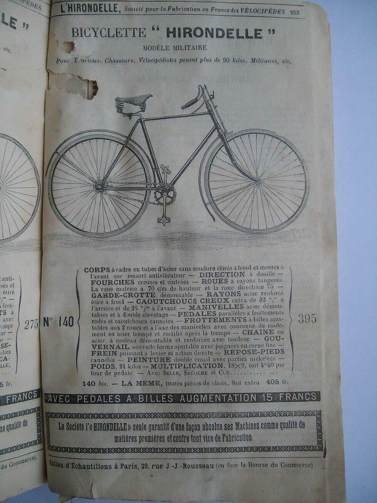 The maker of this bike, which is in my collection, was unknown for some time. Now I think it is a Hirondelle militaire, like the one shown in the catalogue of Manufranec/Hirondelle of 1892.