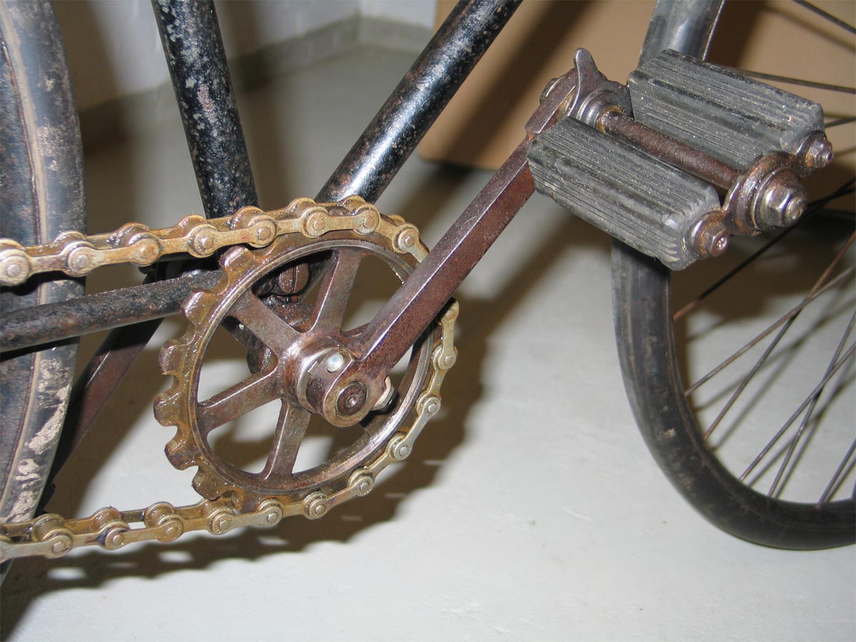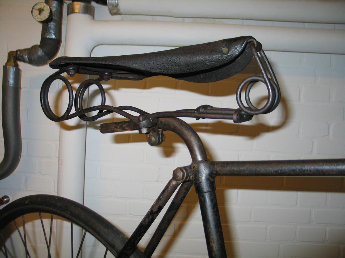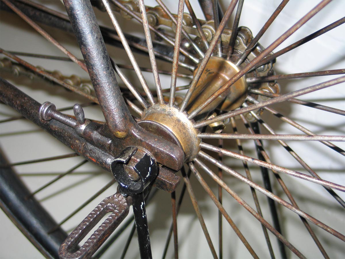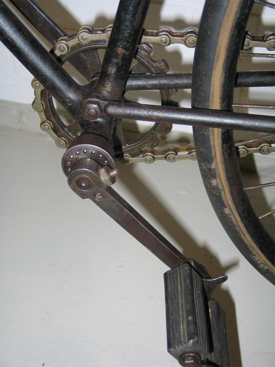 But the strange mount of the bracket is visible, as well as (an indication of) the typical chain tensioners on this bike. The chain is French (Marque deposee) and the saddle has the marque L'ONFRAY of LONFRAY, which sounds French as well....